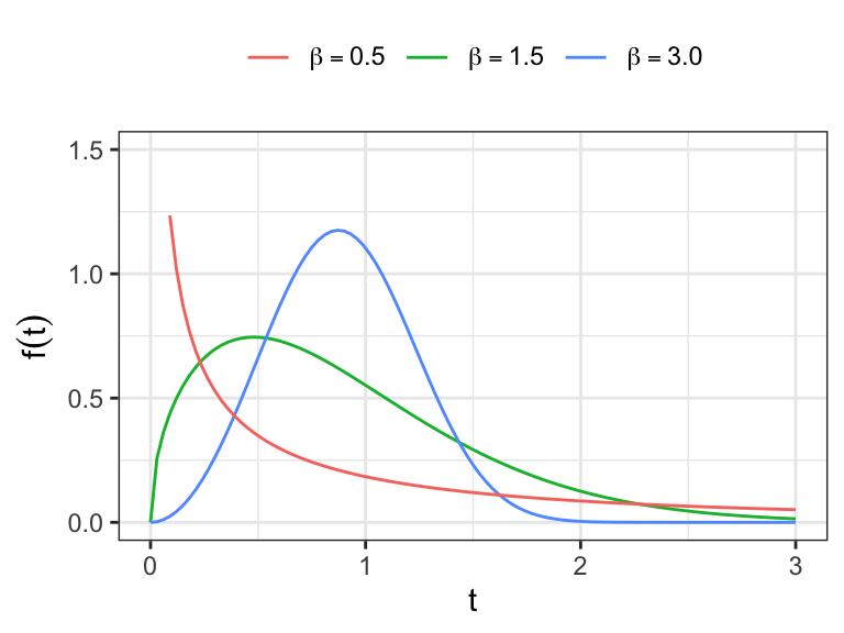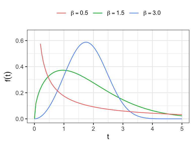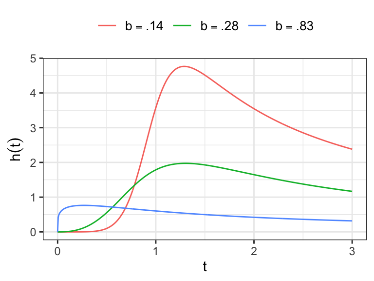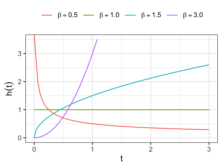For \(\beta>1\): \(h(0)=0\), increases to a maximum, then decreases to \(0\) as \(t\to\infty\) (unimodal hazard).