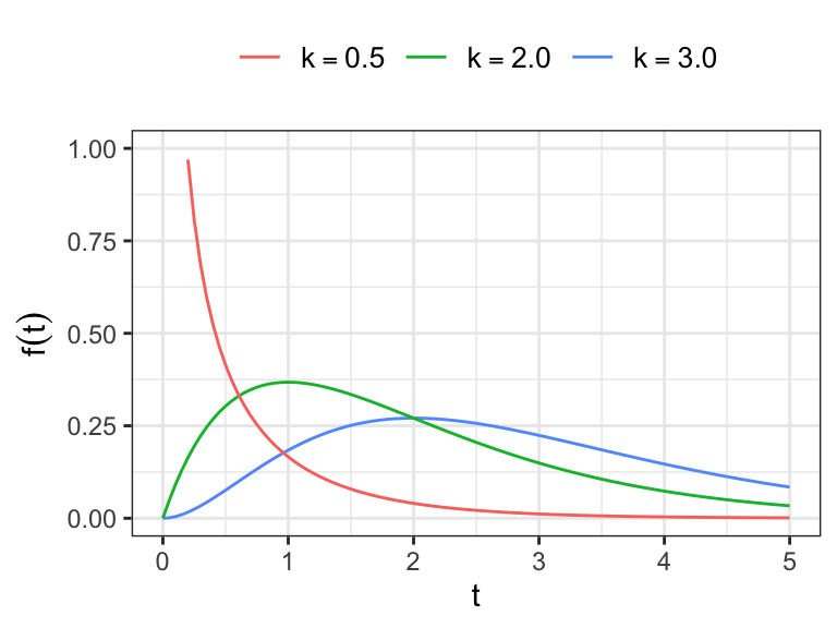 f(t) = \frac{\lambda(\lambda t)^{k-1}\,e^{-\lambda t}}{\Gamma(k)}\;\;\;t>0