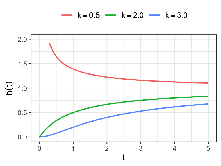 - For \(0<k<1\): \(h(t)\) decreases, \(\displaystyle \lim_{t\to 0}h(t)=\infty\), \(\displaystyle \lim_{t\to\infty}h(t)=\lambda\).