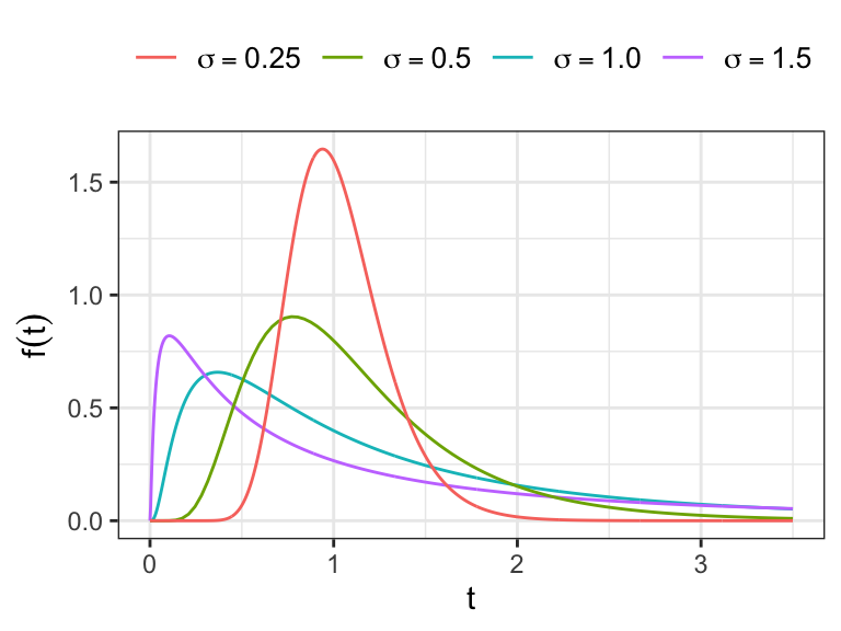 For example, the survivor functions of log-lifetimes are defined as \[ \begin{aligned} S_0(z) &= \exp(-e^z) \;\longrightarrow\;\text{extreme value}\\[.25em] S_0(z) &= 1- \Phi(z) \;\longrightarrow\;\text{normal}\\[.25em] S_0(z) &= (1 + e^z)^{-1} \;\longrightarrow\;\text{logistic} \end{aligned} \]