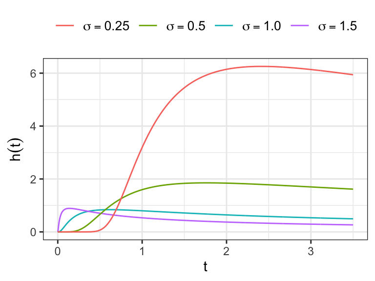 The hazard function \[ h(t)= \frac{\beta}{\alpha} \frac{(t/\alpha)^{\beta-1}}{\big[1+ (t/\alpha)^\beta\big]} \]