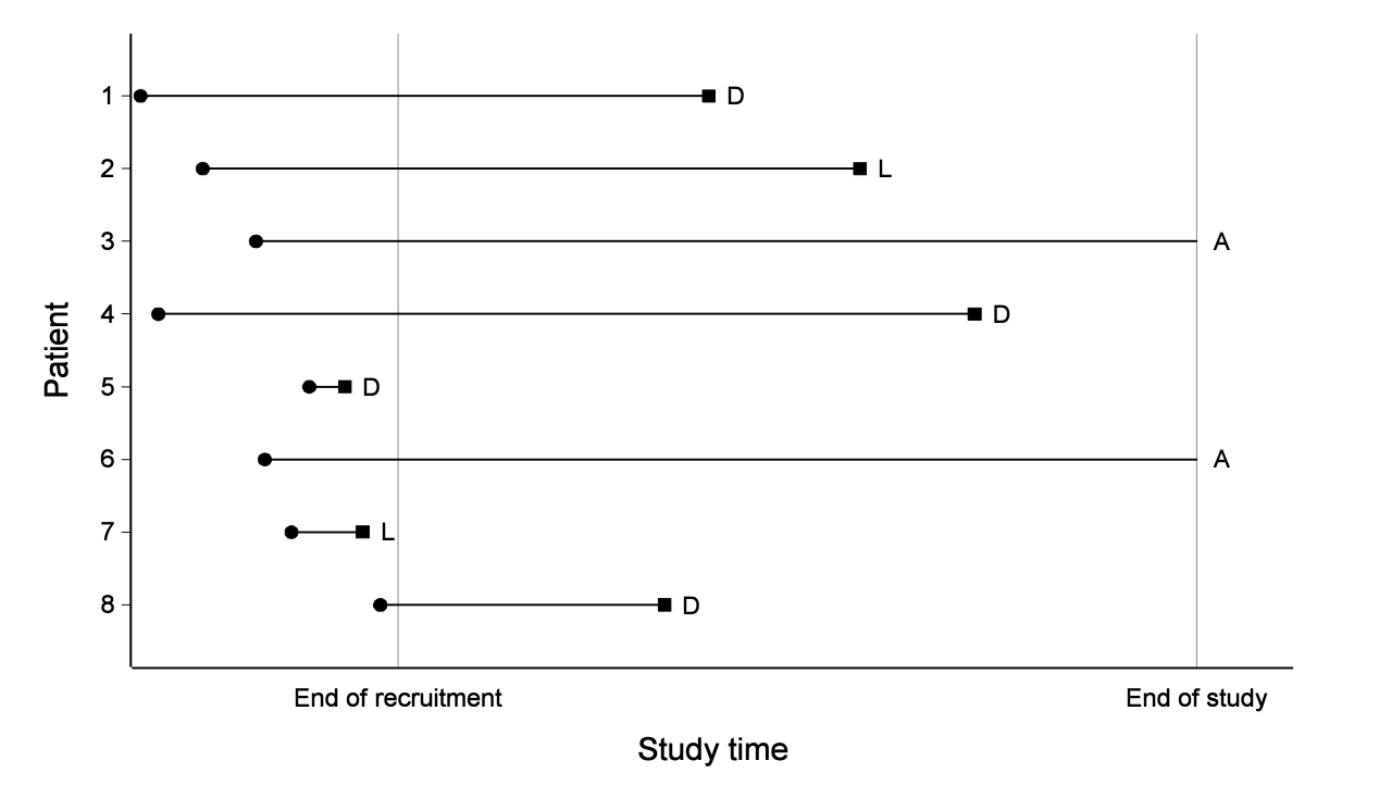 - For patients with potentially fatal diseases, the key outcome is survival time, usually measured from diagnosis or treatment.