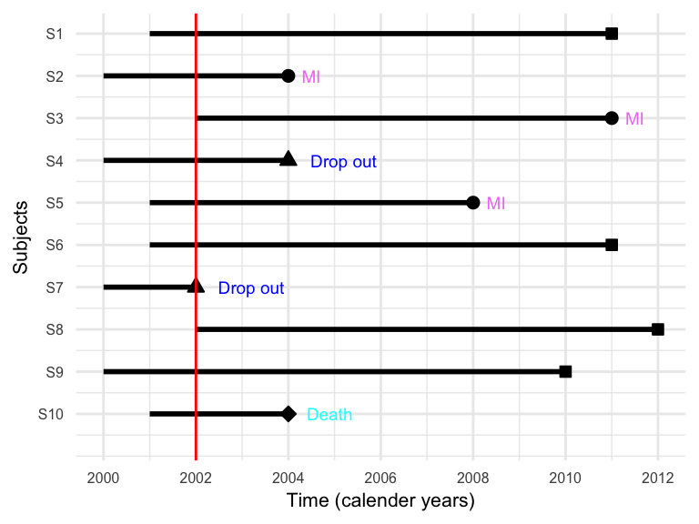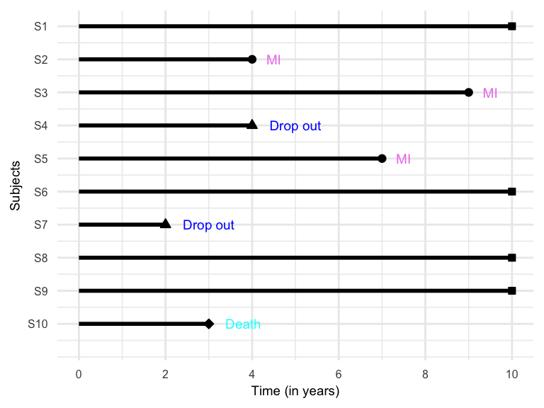 Times for the subjects who did not experience MI by the end of 10-year follow-up or dropped-out or died from causes not related to MI are known as censored times