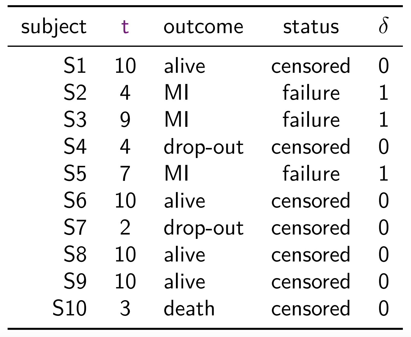 A sample of survival data can also be expressed as following, where \(^+\) sign indicates censored observations \[ 10^+, 4, 9, 4^+, 7, 10^+, 2^+, 10^+, 10^+, 3^+ \]