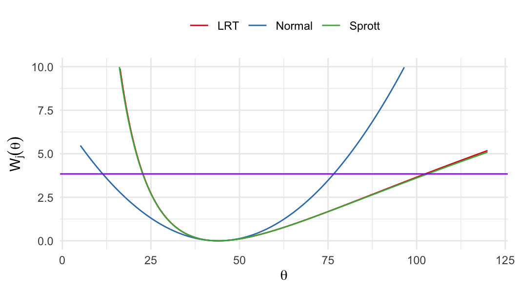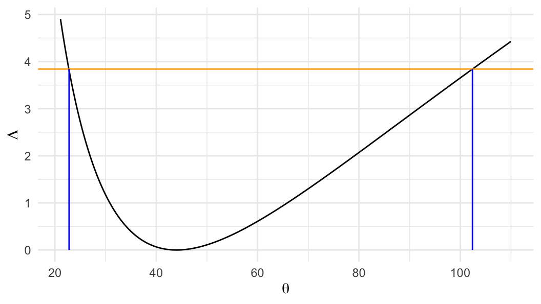 95% CI for \(\theta\) can be obtained from the set of \(\theta\)’s such that \[ \Lambda(\theta) \leq \chi_{(1), .95}^2 = 3.84 \]