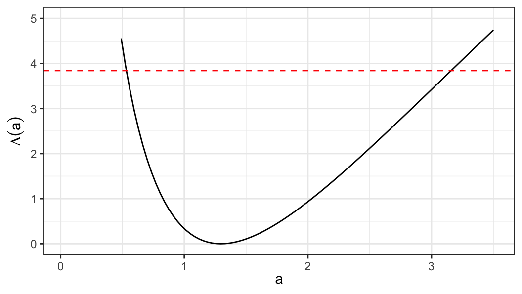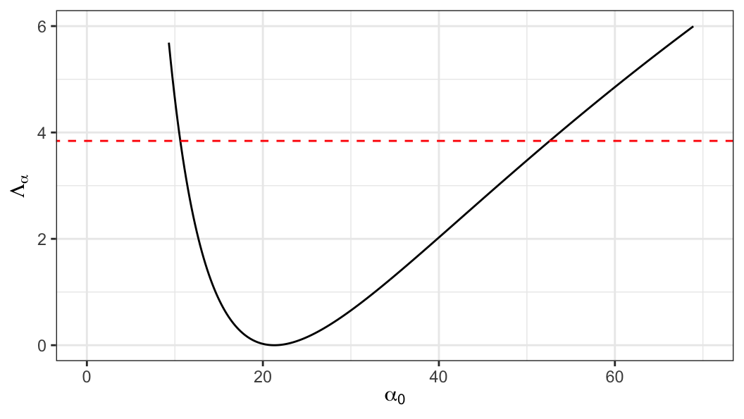 An approximate two-sided \((1-p)100\%\) confidence interval for \(\alpha\) can be obtained from a set of values of \(\alpha_0\) satisfying \[\begin{align} \Lambda_{\alpha}(\alpha_0) \leq \chi^2_{(1), 1-p} \end{align}\]
