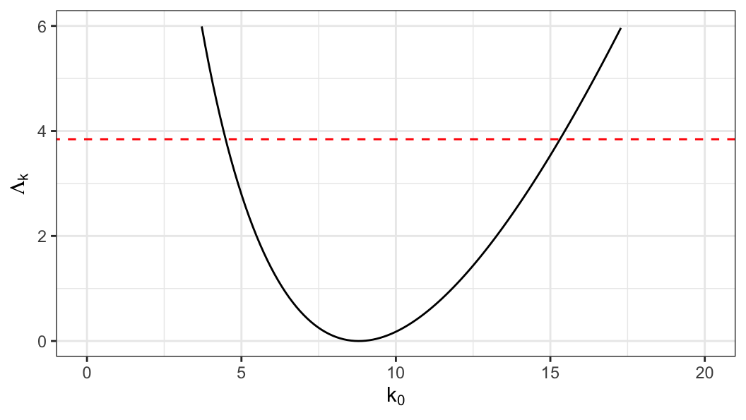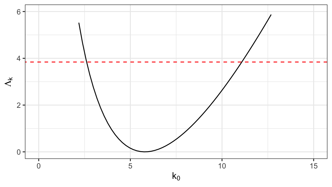 An approximate two-sided \((1-p)100\%\) confidence interval for \(k\) can be obtained from a set of values of \(k_0\) satisfying \[\begin{align} \Lambda_k(k_0) \leq \chi^2_{(1), 1-p} \end{align}\]